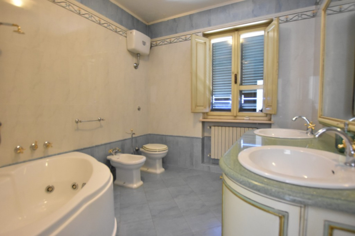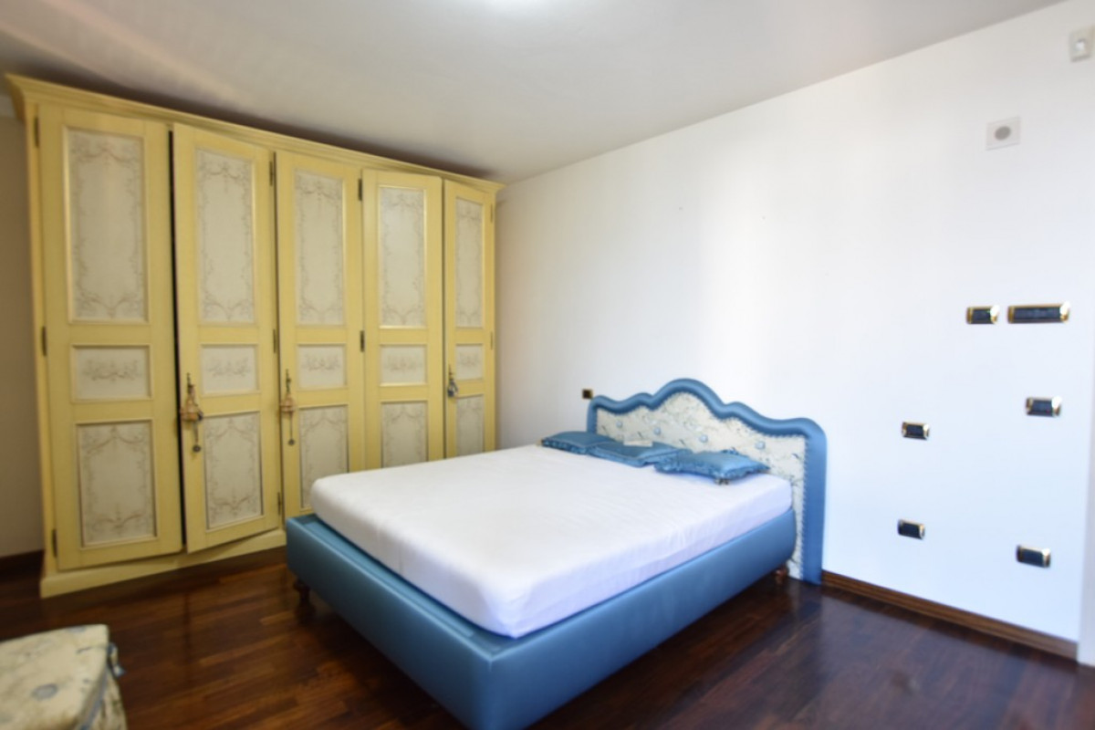 L'ampia scala, oltre che l'ascensore presente nel disimpegno, conducono al piano primo dove si sviluppa la zona notte, composta da cinque camere, di cui due dotate di balconi e tre bagni oltre che un grande ripostiglio.